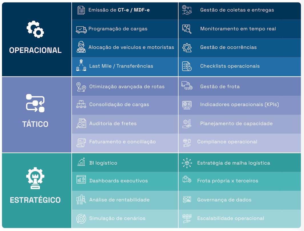 26 anos de experiência no setor, mais de 28 módulos inteligentes, suporte 100% humanizado, conformidade fiscal e LGPD, versões específicas para rodoviário, aéreo e contêiner, e integrações robustas.